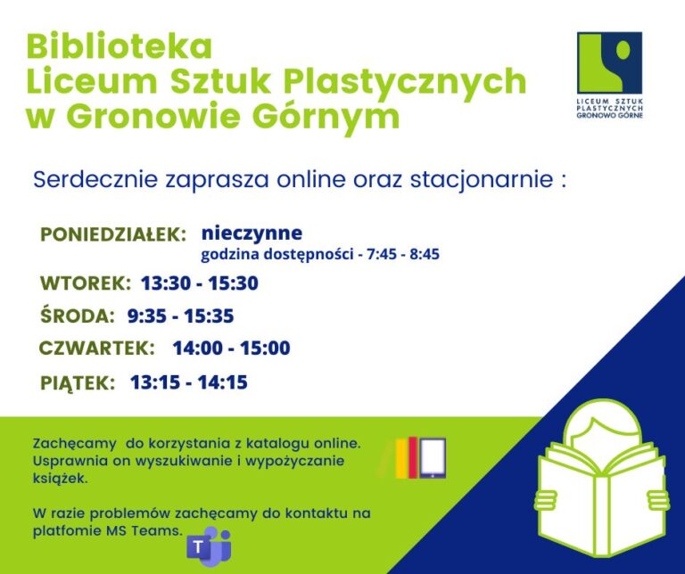 Biblioteka funkcjonuje stacjonarnie oraz zdalnie z wykorzystaniem platformy MS Teams.